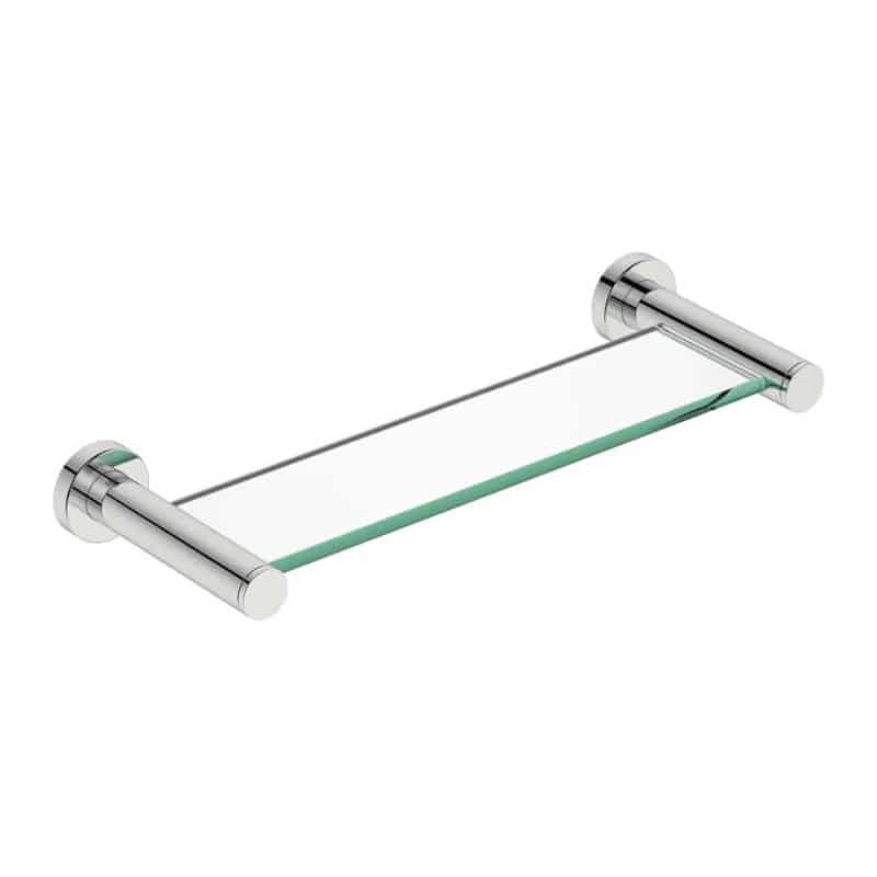 Our glass shelf with its classic, round side bars, was added to this series as an elegant option to beautifully organize your bathroom necessities while complementing most traditional bathroom designs. The side posts are manufactured from Grade 304 stainless steel and a 300mm strong tempered glass shelf that is secured into the side posts with round back plates. It Includes all necessary parts to easily be installed onto wall or tile
